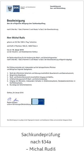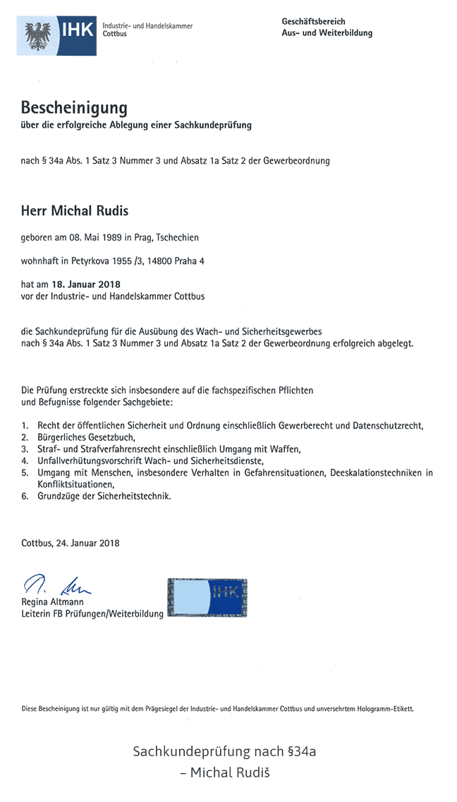 Jako certifikovaný poskytovatel služeb ostrahy objektů v Německu, jsme museli projít mj. i náročným kvalifikačním procesem. Když jsme se na získání kvalifikace v roce 2015 připravovali, ihned bylo jasné, že je požadovaný rozsah znalostí ve všech ohledech bezpečnosti úplně na jiné úrovni než v ČR. Inspirovali jsme se a ihned po vstupu na český trh v roce 2018 jsme vyškolili naše vedení a manažery na nejvyšší možnou úroveň (7) odborné kvalifikace v ČR, kterou i v roce 2020 má v ČR stále pouze hrstka odborníků.